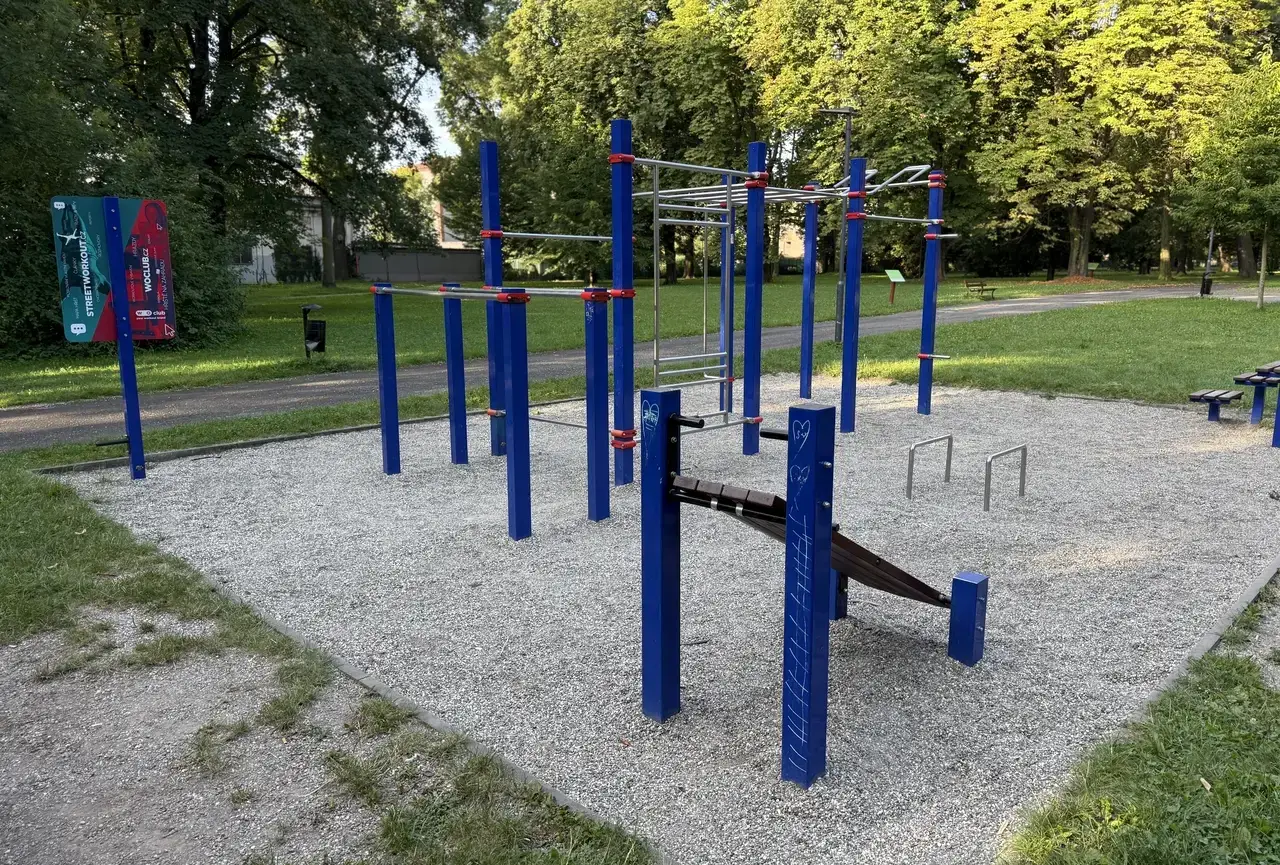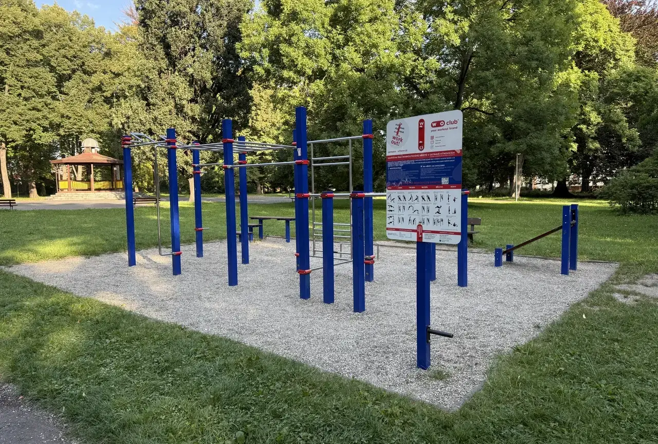 Hřiště je vybavené prvky typickými pro workout a street fitness, jako jsou hrazdy, bradla či další posilovací konstrukce, určené k různým druhům tělesného tréninku bez potřeby klasických strojů.